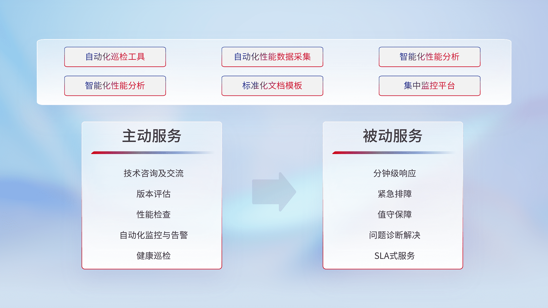 智能化工具和标准化文档,,,,保障服务质量,,提供主动服务(包含技术咨询、、、版本评估、、、性能检查、、、、自动化监控与告警、、、健康巡检)和被动服务包含(分钟级响应、、、、紧急排障、、、、值守保障、、、、问题诊断解决、、、、SLA服务)。。。。